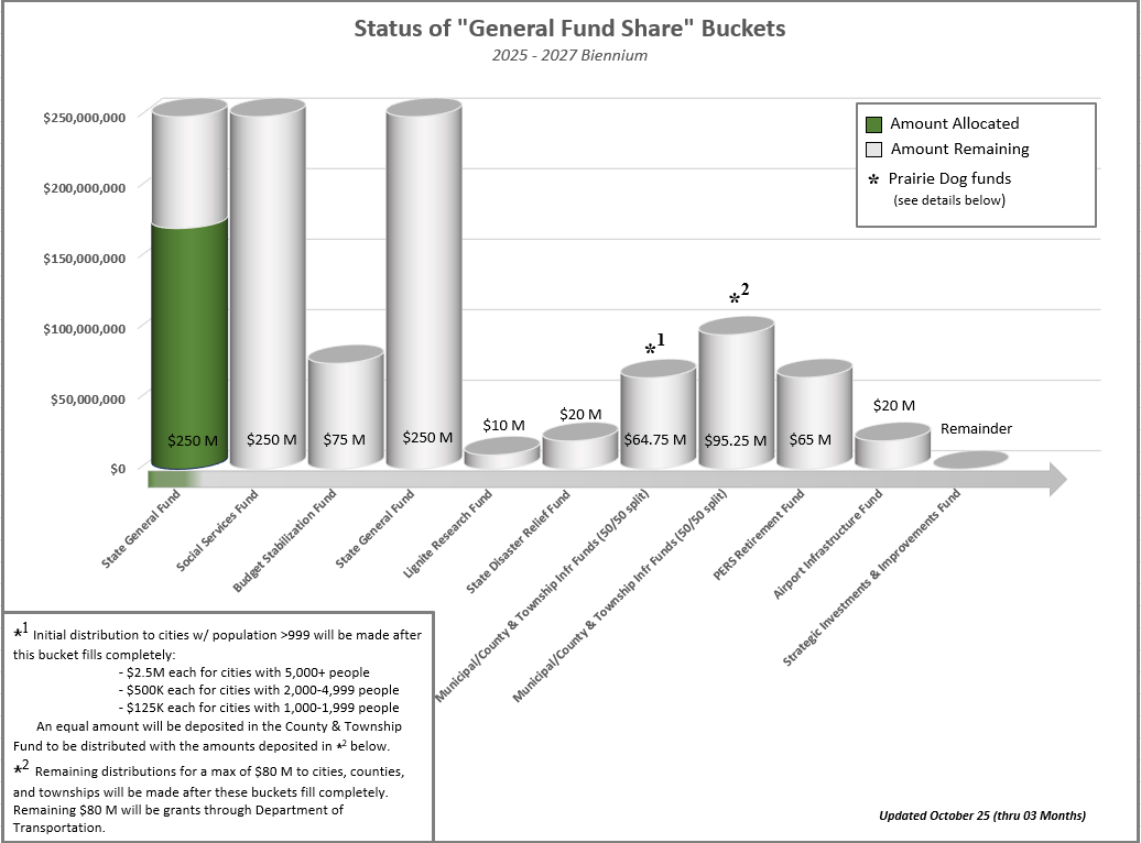 In 2025, SB 2012 reduced the allocations to the infrastructure funds from $250,000,000 of oil and gas tax revenue per biennium to $180,000,000 and moved the infrastructure fund "bucket" up so it may fill earlier in the biennium. In addition to reducing the allocations to the infrastructure funds, SB 2012 appropriates 50% of the funds related to the Municipal Infrastructure Fund and County and Township Infrastructure Fund as a direct distribution from the Office of State Treasurer and appropriates 50% of the funds to North Dakota Department of Transportation for grants. For more information related to grants through Department of Transportation (DOT), please visit DOT's website detailing grant and funding programs.